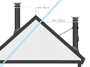 Die Mündung des Schornsteins muss den Dachfirst um mindestens 40 cm überragen und mindestens einen Meter von der Dachfläche entfernt sein.